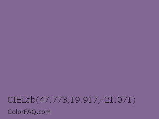 CIELab 47.773,19.917,-21.071 Color is a normal purple color and the nearest color is Trendy Pink #8c6495. Hex code #826795 and RGB value is rgb(130,103,149). In RGB color space, this color is composed of 51% red, 40% green, 58% blue, In CMYK color space, this color is composed of 13% cyan, 31% magenta, 0% yellow , 42% black , In HSL color space, this color has a hue angle of 275° , 18% saturation and 49% lightness.