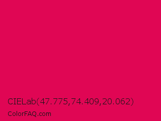 CIELab 47.775,74.409,20.062 Color is a normal rose color and the nearest color is Razzmatazz Crayola #e30b5c. Hex code #e00654 and RGB value is rgb(224,6,84). In RGB color space, this color is composed of 88% red, 2% green, 33% blue, In CMYK color space, this color is composed of 0% cyan, 97% magenta, 63% yellow , 12% black , In HSL color space, this color has a hue angle of 339° , 95% saturation and 45% lightness.