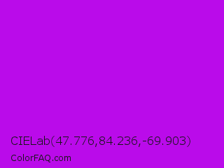 CIELab 47.776,84.236,-69.903 Color is a normal purple color and the nearest color is Vivid Mulberry #b80ce3. Hex code #ba0bea and RGB value is rgb(186,11,234). In RGB color space, this color is composed of 73% red, 4% green, 92% blue, In CMYK color space, this color is composed of 21% cyan, 95% magenta, 0% yellow , 8% black , In HSL color space, this color has a hue angle of 287° , 91% saturation and 48% lightness.
