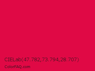 CIELab 47.782,73.794,28.707 Color is a normal rose color and the nearest color is UA Red #d9004c. Hex code #e10846 and RGB value is rgb(225,8,70). In RGB color space, this color is composed of 88% red, 3% green, 27% blue, In CMYK color space, this color is composed of 0% cyan, 96% magenta, 69% yellow , 12% black , In HSL color space, this color has a hue angle of 343° , 93% saturation and 46% lightness.