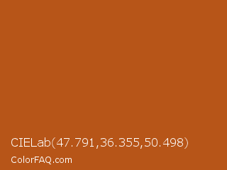 CIELab 47.791,36.355,50.498 Color is a normal orange color and the nearest color is Fiery Orange #b35213. Hex code #b75518 and RGB value is rgb(183,85,24). In RGB color space, this color is composed of 72% red, 33% green, 9% blue, In CMYK color space, this color is composed of 0% cyan, 54% magenta, 87% yellow , 28% black , In HSL color space, this color has a hue angle of 23° , 77% saturation and 41% lightness.