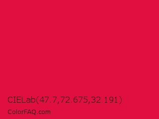 CIELab 47.7,72.675,32.191 Color is a normal red color and the nearest color is Crimson #dc143c. Hex code #e00f40 and RGB value is rgb(224,15,64). In RGB color space, this color is composed of 88% red, 6% green, 25% blue, In CMYK color space, this color is composed of 0% cyan, 93% magenta, 71% yellow , 12% black , In HSL color space, this color has a hue angle of 346° , 87% saturation and 47% lightness.
