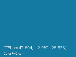 CIELab 47.804,-12.982,-28.556 Color is a normal blue color and the nearest color is CG Blue #007aa5. Hex code #147aa1 and RGB value is rgb(20,122,161). In RGB color space, this color is composed of 8% red, 48% green, 63% blue, In CMYK color space, this color is composed of 88% cyan, 24% magenta, 0% yellow , 37% black , In HSL color space, this color has a hue angle of 197° , 78% saturation and 35% lightness.