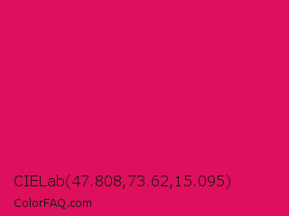 CIELab 47.808,73.62,15.095 Color is a normal rose color and the nearest color is Ruby #e0115f. Hex code #de0f5c and RGB value is rgb(222,15,92). In RGB color space, this color is composed of 87% red, 6% green, 36% blue, In CMYK color space, this color is composed of 0% cyan, 93% magenta, 59% yellow , 13% black , In HSL color space, this color has a hue angle of 338° , 87% saturation and 46% lightness.