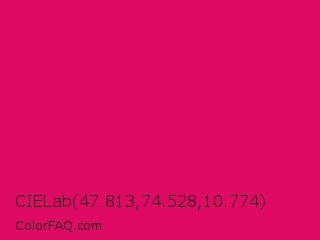CIELab 47.813,74.528,10.774 Color is a normal rose color and the nearest color is Raspberry #e30b5d. Hex code #de0a63 and RGB value is rgb(222,10,99). In RGB color space, this color is composed of 87% red, 4% green, 39% blue, In CMYK color space, this color is composed of 0% cyan, 95% magenta, 55% yellow , 13% black , In HSL color space, this color has a hue angle of 335° , 91% saturation and 45% lightness.