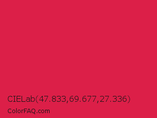 CIELab 47.833,69.677,27.336 Color is a normal red color and the nearest color is Spanish Crimson #e51a4c. Hex code #dc1f48 and RGB value is rgb(220,31,72). In RGB color space, this color is composed of 86% red, 12% green, 28% blue, In CMYK color space, this color is composed of 0% cyan, 86% magenta, 67% yellow , 14% black , In HSL color space, this color has a hue angle of 347° , 75% saturation and 49% lightness.