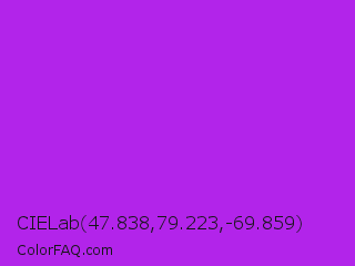 CIELab 47.838,79.223,-69.859 Color is a normal purple color and the nearest color is Veronica #a020f0. Hex code #b224ea and RGB value is rgb(178,36,234). In RGB color space, this color is composed of 70% red, 14% green, 92% blue, In CMYK color space, this color is composed of 24% cyan, 85% magenta, 0% yellow , 8% black , In HSL color space, this color has a hue angle of 283° , 83% saturation and 53% lightness.
