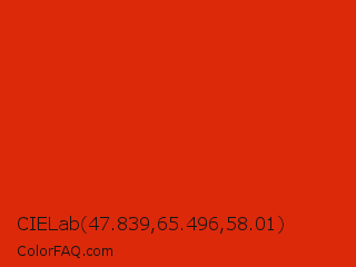 CIELab 47.839,65.496,58.01 Color is a normal red color and the nearest color is Maximum Red #d92121. Hex code #db290a and RGB value is rgb(219,41,10). In RGB color space, this color is composed of 86% red, 16% green, 4% blue, In CMYK color space, this color is composed of 0% cyan, 81% magenta, 95% yellow , 14% black , In HSL color space, this color has a hue angle of 9° , 91% saturation and 45% lightness.