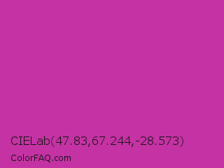 CIELab 47.83,67.244,-28.573 Color is a normal magenta color and the nearest color is Byzantine #bd33a4. Hex code #c432a3 and RGB value is rgb(196,50,163). In RGB color space, this color is composed of 77% red, 20% green, 64% blue, In CMYK color space, this color is composed of 0% cyan, 74% magenta, 17% yellow , 23% black , In HSL color space, this color has a hue angle of 314° , 59% saturation and 48% lightness.