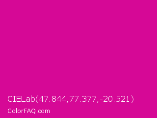 CIELab 47.844,77.377,-20.521 Color is a normal magenta color and the nearest color is Red Violet #c71585. Hex code #d60896 and RGB value is rgb(214,8,150). In RGB color space, this color is composed of 84% red, 3% green, 59% blue, In CMYK color space, this color is composed of 0% cyan, 96% magenta, 30% yellow , 16% black , In HSL color space, this color has a hue angle of 319° , 93% saturation and 44% lightness.