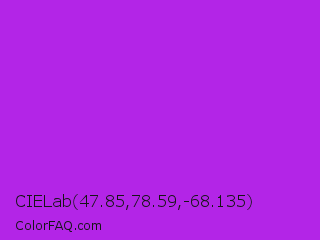 CIELab 47.85,78.59,-68.135 Color is a normal purple color and the nearest color is Veronica #a020f0. Hex code #b325e7 and RGB value is rgb(179,37,231). In RGB color space, this color is composed of 70% red, 15% green, 91% blue, In CMYK color space, this color is composed of 23% cyan, 84% magenta, 0% yellow , 9% black , In HSL color space, this color has a hue angle of 284° , 80% saturation and 53% lightness.