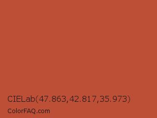 CIELab 47.863,42.817,35.973 Color is a normal red color and the nearest color is Mojo #c04737. Hex code #bd4f37 and RGB value is rgb(189,79,55). In RGB color space, this color is composed of 74% red, 31% green, 22% blue, In CMYK color space, this color is composed of 0% cyan, 58% magenta, 71% yellow , 26% black , In HSL color space, this color has a hue angle of 11° , 55% saturation and 48% lightness.