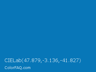 CIELab 47.879,-3.136,-41.827 Color is a normal blue color and the nearest color is Star Command Blue #007bb8. Hex code #0777b8 and RGB value is rgb(7,119,184). In RGB color space, this color is composed of 3% red, 47% green, 72% blue, In CMYK color space, this color is composed of 96% cyan, 35% magenta, 0% yellow , 28% black , In HSL color space, this color has a hue angle of 202° , 93% saturation and 37% lightness.