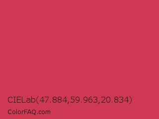 CIELab 47.884,59.963,20.834 Color is a normal red color and the nearest color is Brick Red #cb4154. Hex code #cf3852 and RGB value is rgb(207,56,82). In RGB color space, this color is composed of 81% red, 22% green, 32% blue, In CMYK color space, this color is composed of 0% cyan, 73% magenta, 60% yellow , 19% black , In HSL color space, this color has a hue angle of 350° , 61% saturation and 52% lightness.