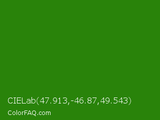 CIELab 47.913,-46.87,49.543 Color is a dark green color and the nearest color is Napier Green #2a8000. Hex code #29830a and RGB value is rgb(41,131,10). In RGB color space, this color is composed of 16% red, 51% green, 4% blue, In CMYK color space, this color is composed of 69% cyan, 0% magenta, 92% yellow , 49% black , In HSL color space, this color has a hue angle of 105° , 86% saturation and 28% lightness.