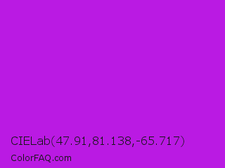 CIELab 47.91,81.138,-65.717 Color is a normal purple color and the nearest color is Vivid Mulberry #b80ce3. Hex code #ba1ae3 and RGB value is rgb(186,26,227). In RGB color space, this color is composed of 73% red, 10% green, 89% blue, In CMYK color space, this color is composed of 18% cyan, 89% magenta, 0% yellow , 11% black , In HSL color space, this color has a hue angle of 288° , 79% saturation and 50% lightness.