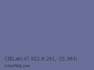CIELab 47.922,8.261,-23.384 Color is a normal blue color and the nearest color is Dark Blue Gray #666699. Hex code #6a6f99 and RGB value is rgb(106,111,153). In RGB color space, this color is composed of 42% red, 44% green, 60% blue, In CMYK color space, this color is composed of 31% cyan, 27% magenta, 0% yellow , 40% black , In HSL color space, this color has a hue angle of 234° , 19% saturation and 51% lightness.