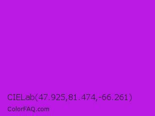 CIELab 47.925,81.474,-66.261 Color is a normal purple color and the nearest color is Vivid Mulberry #b80ce3. Hex code #ba19e4 and RGB value is rgb(186,25,228). In RGB color space, this color is composed of 73% red, 10% green, 89% blue, In CMYK color space, this color is composed of 18% cyan, 89% magenta, 0% yellow , 11% black , In HSL color space, this color has a hue angle of 288° , 80% saturation and 50% lightness.