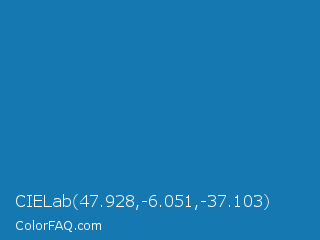 CIELab 47.928,-6.051,-37.103 Color is a normal blue color and the nearest color is Green Blue #1164b4. Hex code #1678b0 and RGB value is rgb(22,120,176). In RGB color space, this color is composed of 9% red, 47% green, 69% blue, In CMYK color space, this color is composed of 88% cyan, 32% magenta, 0% yellow , 31% black , In HSL color space, this color has a hue angle of 202° , 78% saturation and 39% lightness.