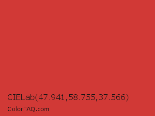 CIELab 47.941,58.755,37.566 Color is a normal red color and the nearest color is Madder Lake #cc3336. Hex code #d13936 and RGB value is rgb(209,57,54). In RGB color space, this color is composed of 82% red, 22% green, 21% blue, In CMYK color space, this color is composed of 0% cyan, 73% magenta, 74% yellow , 18% black , In HSL color space, this color has a hue angle of 1° , 63% saturation and 52% lightness.