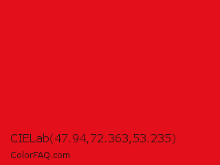 CIELab 47.94,72.363,53.235 Color is a normal red color and the nearest color is Cadmium Red #e30022. Hex code #e30f1a and RGB value is rgb(227,15,26). In RGB color space, this color is composed of 89% red, 6% green, 10% blue, In CMYK color space, this color is composed of 0% cyan, 93% magenta, 89% yellow , 11% black , In HSL color space, this color has a hue angle of 357° , 88% saturation and 47% lightness.