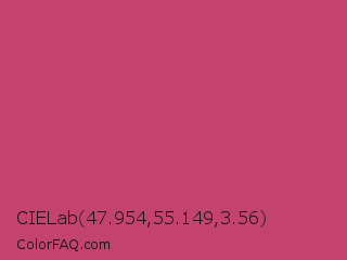 CIELab 47.954,55.149,3.56 Color is a normal rose color and the nearest color is Fuchsia Rose #c74375. Hex code #c4426e and RGB value is rgb(196,66,110). In RGB color space, this color is composed of 77% red, 26% green, 43% blue, In CMYK color space, this color is composed of 0% cyan, 66% magenta, 44% yellow , 23% black , In HSL color space, this color has a hue angle of 340° , 52% saturation and 51% lightness.