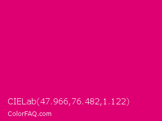 CIELab 47.966,76.482,1.122 Color is a normal rose color and the nearest color is Red Purple #e40078. Hex code #de0073 and RGB value is rgb(222,0,115). In RGB color space, this color is composed of 87% red, 0% green, 45% blue, In CMYK color space, this color is composed of 0% cyan, 100% magenta, 48% yellow , 13% black , In HSL color space, this color has a hue angle of 329° , 100% saturation and 44% lightness.