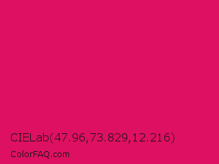 CIELab 47.96,73.829,12.216 Color is a normal rose color and the nearest color is Ruby #e0115f. Hex code #de1061 and RGB value is rgb(222,16,97). In RGB color space, this color is composed of 87% red, 6% green, 38% blue, In CMYK color space, this color is composed of 0% cyan, 93% magenta, 56% yellow , 13% black , In HSL color space, this color has a hue angle of 336° , 87% saturation and 47% lightness.