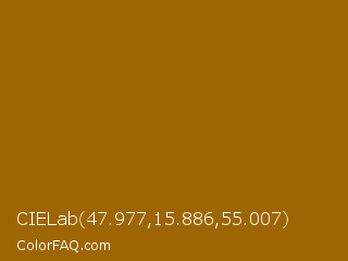 CIELab 47.977,15.886,55.007 Color is a normal orange color and the nearest color is Gamboge Orange Brown #996600. Hex code #9e6602 and RGB value is rgb(158,102,2). In RGB color space, this color is composed of 62% red, 40% green, 1% blue, In CMYK color space, this color is composed of 0% cyan, 35% magenta, 99% yellow , 38% black , In HSL color space, this color has a hue angle of 38° , 98% saturation and 31% lightness.