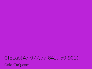 CIELab 47.977,77.841,-59.901 Color is a normal purple color and the nearest color is Vivid Mulberry #b80ce3. Hex code #bb23d9 and RGB value is rgb(187,35,217). In RGB color space, this color is composed of 73% red, 14% green, 85% blue, In CMYK color space, this color is composed of 14% cyan, 84% magenta, 0% yellow , 15% black , In HSL color space, this color has a hue angle of 290° , 72% saturation and 49% lightness.