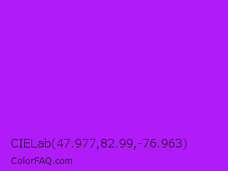 CIELab 47.977,82.99,-76.963 Color is a normal purple color and the nearest color is Veronica #a020f0. Hex code #b01cf7 and RGB value is rgb(176,28,247). In RGB color space, this color is composed of 69% red, 11% green, 97% blue, In CMYK color space, this color is composed of 29% cyan, 89% magenta, 0% yellow , 3% black , In HSL color space, this color has a hue angle of 281° , 93% saturation and 54% lightness.