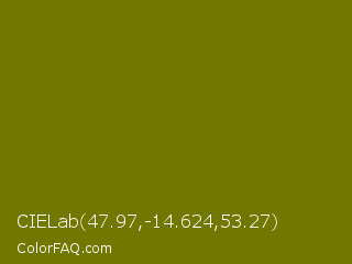 CIELab 47.97,-14.624,53.27 Color is a dark yellow color and the nearest color is Bronze Yellow #737000. Hex code #727700 and RGB value is rgb(114,119,0). In RGB color space, this color is composed of 45% red, 47% green, 0% blue, In CMYK color space, this color is composed of 4% cyan, 0% magenta, 100% yellow , 53% black , In HSL color space, this color has a hue angle of 63° , 100% saturation and 23% lightness.