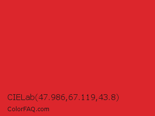 CIELab 47.986,67.119,43.8 Color is a normal red color and the nearest color is Permanent Geranium Lake #e12c2c. Hex code #dc262c and RGB value is rgb(220,38,44). In RGB color space, this color is composed of 86% red, 15% green, 17% blue, In CMYK color space, this color is composed of 0% cyan, 83% magenta, 80% yellow , 14% black , In HSL color space, this color has a hue angle of 358° , 72% saturation and 51% lightness.