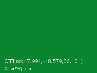 CIELab 47.991,-48.579,36.101 Color is a dark green color and the nearest color is La Salle Green #087830. Hex code #0b8430 and RGB value is rgb(11,132,48). In RGB color space, this color is composed of 4% red, 52% green, 19% blue, In CMYK color space, this color is composed of 92% cyan, 0% magenta, 64% yellow , 48% black , In HSL color space, this color has a hue angle of 138° , 85% saturation and 28% lightness.