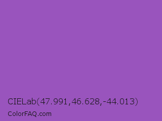 CIELab 47.991,46.628,-44.013 Color is a normal purple color and the nearest color is Deep Lilac #9955bb. Hex code #9954bd and RGB value is rgb(153,84,189). In RGB color space, this color is composed of 60% red, 33% green, 74% blue, In CMYK color space, this color is composed of 19% cyan, 56% magenta, 0% yellow , 26% black , In HSL color space, this color has a hue angle of 279° , 44% saturation and 54% lightness.