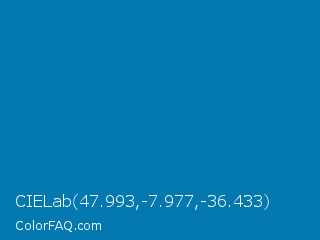 CIELab 47.993,-7.977,-36.433 Color is a normal blue color and the nearest color is Deep Cerulean #007ba7. Hex code #0379af and RGB value is rgb(3,121,175). In RGB color space, this color is composed of 1% red, 47% green, 69% blue, In CMYK color space, this color is composed of 98% cyan, 31% magenta, 0% yellow , 31% black , In HSL color space, this color has a hue angle of 199° , 97% saturation and 35% lightness.