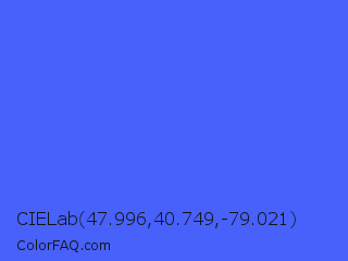 CIELab 47.996,40.749,-79.021 Color is a light blue color and the nearest color is Ultramarine Blue #4166f5. Hex code #4761fa and RGB value is rgb(71,97,250). In RGB color space, this color is composed of 28% red, 38% green, 98% blue, In CMYK color space, this color is composed of 72% cyan, 61% magenta, 0% yellow , 2% black , In HSL color space, this color has a hue angle of 231° , 95% saturation and 63% lightness.