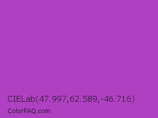 CIELab 47.997,62.589,-46.716 Color is a normal magenta color and the nearest color is Fuchsia Pink #c154c1. Hex code #b040c2 and RGB value is rgb(176,64,194). In RGB color space, this color is composed of 69% red, 25% green, 76% blue, In CMYK color space, this color is composed of 9% cyan, 67% magenta, 0% yellow , 24% black , In HSL color space, this color has a hue angle of 292° , 52% saturation and 51% lightness.