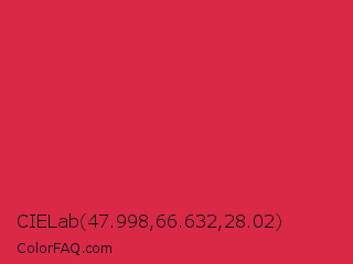 CIELab 47.998,66.632,28.02 Color is a normal red color and the nearest color is Rusty Red #da2c43. Hex code #d92947 and RGB value is rgb(217,41,71). In RGB color space, this color is composed of 85% red, 16% green, 28% blue, In CMYK color space, this color is composed of 0% cyan, 81% magenta, 67% yellow , 15% black , In HSL color space, this color has a hue angle of 350° , 70% saturation and 51% lightness.