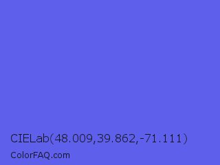 CIELab 48.009,39.862,-71.111 Color is a light blue color and the nearest color is Very Light Blue #6666ff. Hex code #5e60ec and RGB value is rgb(94,96,236). In RGB color space, this color is composed of 37% red, 38% green, 93% blue, In CMYK color space, this color is composed of 60% cyan, 59% magenta, 0% yellow , 7% black , In HSL color space, this color has a hue angle of 239° , 79% saturation and 65% lightness.