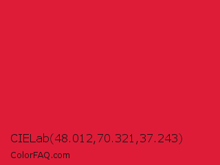 CIELab 48.012,70.321,37.243 Color is a normal red color and the nearest color is Crimson #dc143c. Hex code #df1c38 and RGB value is rgb(223,28,56). In RGB color space, this color is composed of 87% red, 11% green, 22% blue, In CMYK color space, this color is composed of 0% cyan, 87% magenta, 75% yellow , 13% black , In HSL color space, this color has a hue angle of 351° , 78% saturation and 49% lightness.