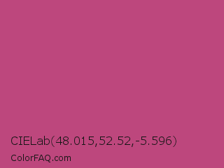CIELab 48.015,52.52,-5.596 Color is a normal rose color and the nearest color is Fuchsia Rose #c74375. Hex code #bd477d and RGB value is rgb(189,71,125). In RGB color space, this color is composed of 74% red, 28% green, 49% blue, In CMYK color space, this color is composed of 0% cyan, 62% magenta, 34% yellow , 26% black , In HSL color space, this color has a hue angle of 333° , 47% saturation and 51% lightness.