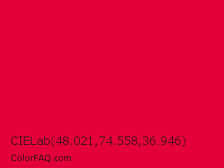 CIELab 48.021,74.558,36.946 Color is a normal red color and the nearest color is Medium Candy Apple Red #e2062c. Hex code #e40139 and RGB value is rgb(228,1,57). In RGB color space, this color is composed of 89% red, 0% green, 22% blue, In CMYK color space, this color is composed of 0% cyan, 100% magenta, 75% yellow , 11% black , In HSL color space, this color has a hue angle of 345° , 99% saturation and 45% lightness.