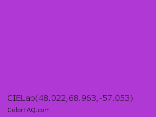 CIELab 48.022,68.963,-57.053 Color is a normal purple color and the nearest color is Dark Orchid #9932cc. Hex code #b038d4 and RGB value is rgb(176,56,212). In RGB color space, this color is composed of 69% red, 22% green, 83% blue, In CMYK color space, this color is composed of 17% cyan, 74% magenta, 0% yellow , 17% black , In HSL color space, this color has a hue angle of 286° , 64% saturation and 53% lightness.
