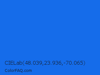 CIELab 48.039,23.936,-70.065 Color is a normal blue color and the nearest color is Blue Crayola #1f75fe. Hex code #156cea and RGB value is rgb(21,108,234). In RGB color space, this color is composed of 8% red, 42% green, 92% blue, In CMYK color space, this color is composed of 91% cyan, 54% magenta, 0% yellow , 8% black , In HSL color space, this color has a hue angle of 215° , 84% saturation and 50% lightness.