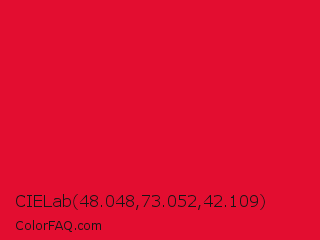 CIELab 48.048,73.052,42.109 Color is a normal red color and the nearest color is Medium Candy Apple Red #e2062c. Hex code #e30d30 and RGB value is rgb(227,13,48). In RGB color space, this color is composed of 89% red, 5% green, 19% blue, In CMYK color space, this color is composed of 0% cyan, 94% magenta, 79% yellow , 11% black , In HSL color space, this color has a hue angle of 350° , 89% saturation and 47% lightness.