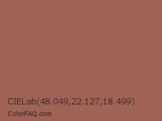 CIELab 48.049,22.127,18.499 Color is a normal red color and the nearest color is Redwood #a45a52. Hex code #9e6354 and RGB value is rgb(158,99,84). In RGB color space, this color is composed of 62% red, 39% green, 33% blue, In CMYK color space, this color is composed of 0% cyan, 37% magenta, 47% yellow , 38% black , In HSL color space, this color has a hue angle of 12° , 31% saturation and 47% lightness.