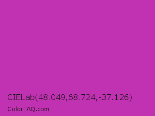 CIELab 48.049,68.724,-37.126 Color is a normal magenta color and the nearest color is Byzantine #bd33a4. Hex code #c132b2 and RGB value is rgb(193,50,178). In RGB color space, this color is composed of 76% red, 20% green, 70% blue, In CMYK color space, this color is composed of 0% cyan, 74% magenta, 8% yellow , 24% black , In HSL color space, this color has a hue angle of 306° , 59% saturation and 48% lightness.