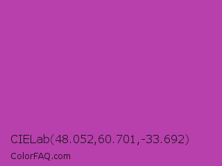 CIELab 48.052,60.701,-33.692 Color is a normal magenta color and the nearest color is Byzantine #bd33a4. Hex code #b840ac and RGB value is rgb(184,64,172). In RGB color space, this color is composed of 72% red, 25% green, 67% blue, In CMYK color space, this color is composed of 0% cyan, 65% magenta, 7% yellow , 28% black , In HSL color space, this color has a hue angle of 306° , 48% saturation and 49% lightness.