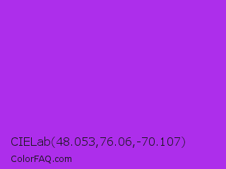 CIELab 48.053,76.06,-70.107 Color is a normal purple color and the nearest color is Veronica #a020f0. Hex code #ad2eeb and RGB value is rgb(173,46,235). In RGB color space, this color is composed of 68% red, 18% green, 92% blue, In CMYK color space, this color is composed of 26% cyan, 80% magenta, 0% yellow , 8% black , In HSL color space, this color has a hue angle of 280° , 83% saturation and 55% lightness.